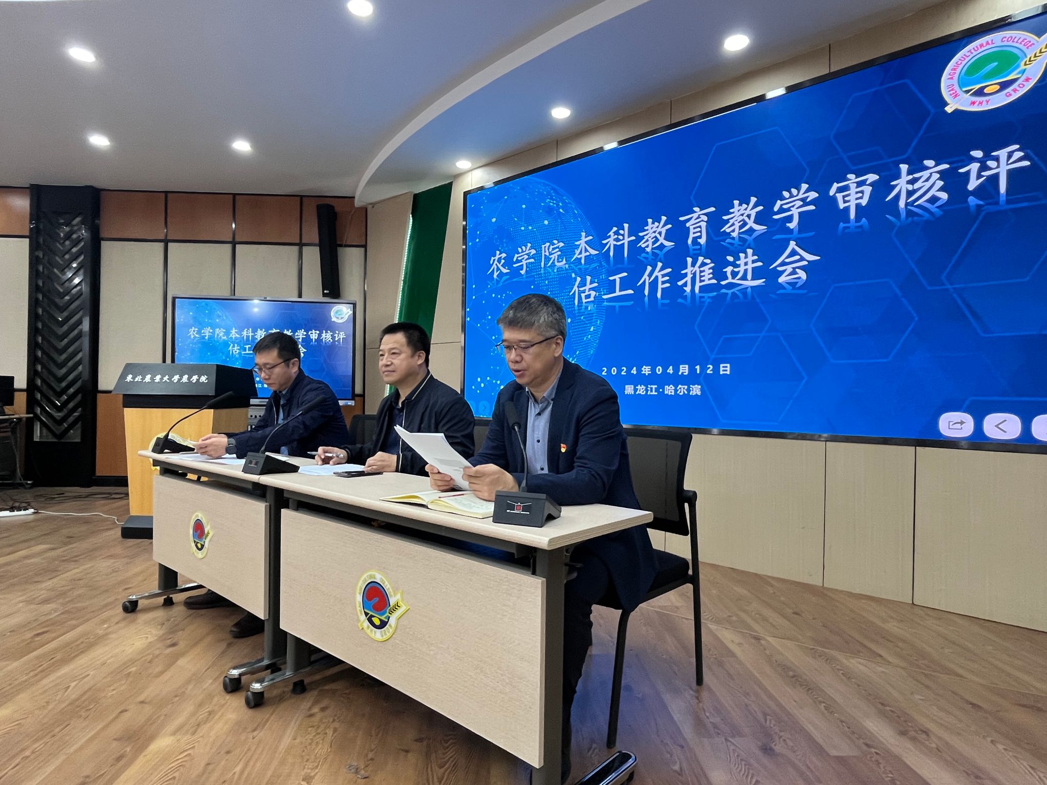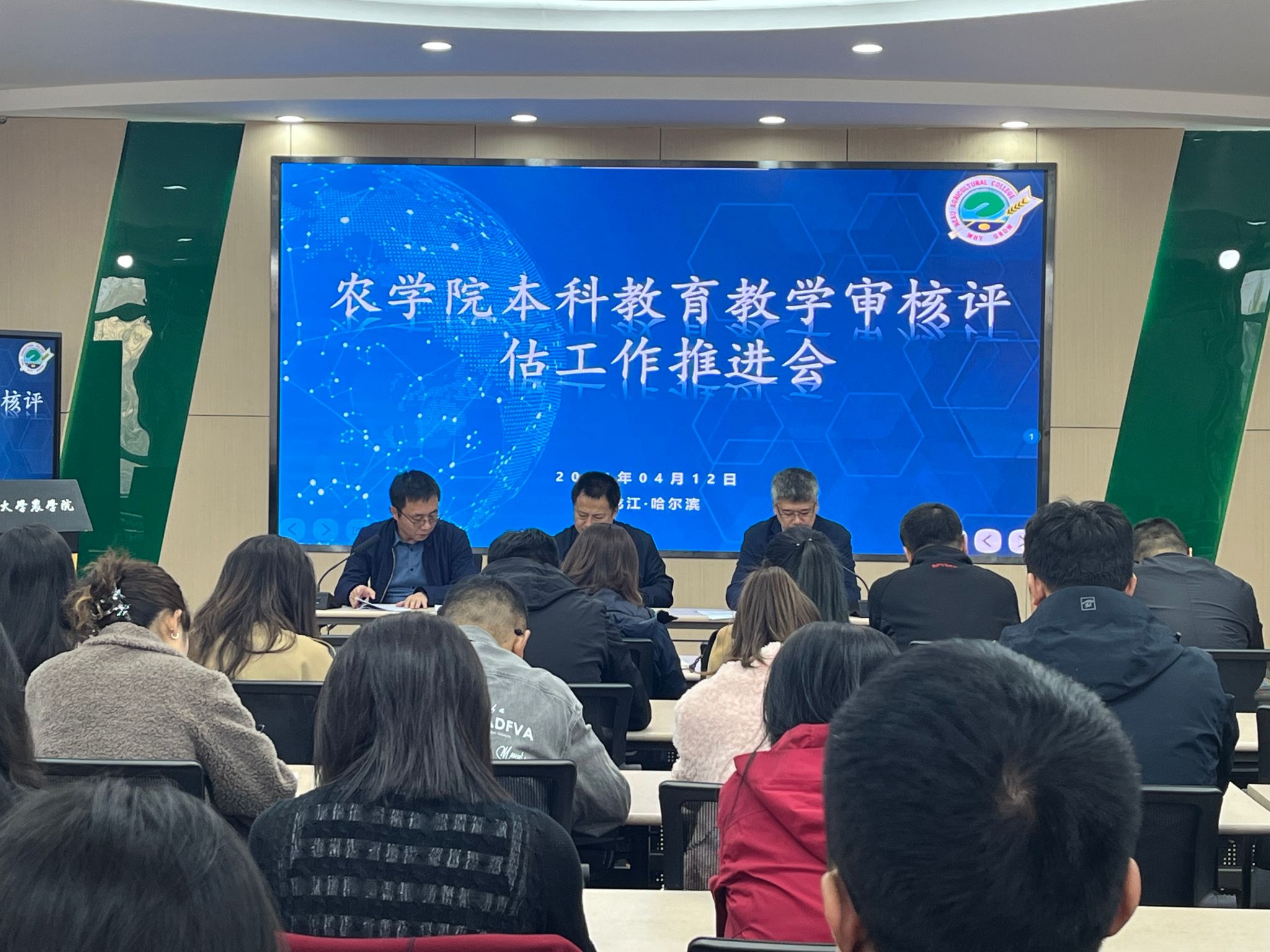 院长陈庆山宣读了《东北农业大学本科教育教学审核评估学院工作任务》文件。他指出,学院是审核评估的主体,是专家考察的重点,全体师生员工要积极参与评建工作,营造人人参与评估、关心评估的良好氛围。