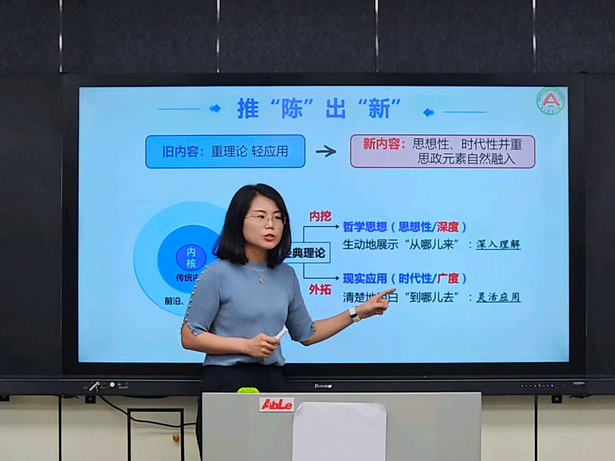 施雯针对“因何创新”“如何创新”和“创新成效”等当前青年教师最为关注的教育教学问题进行逐个分析、逐步解决。在回答“如何创新”这一时代之问时,分别从目标、理念、内容、方法、评价等五方面入手,结合自身教学改革思路与实践经验,全面分享了在教学领域中发现问题、解决问题的成熟思路,并通过善用思政要素、互联网要素赋能教学创新,真正促进青年教师打开思路、提升能力、改进教学。